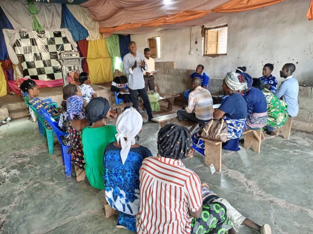 Projektmanager Joseph Mbokani (rechts) im Gespräch mit einigen Frauen der Startfinanzierungsgruppe.