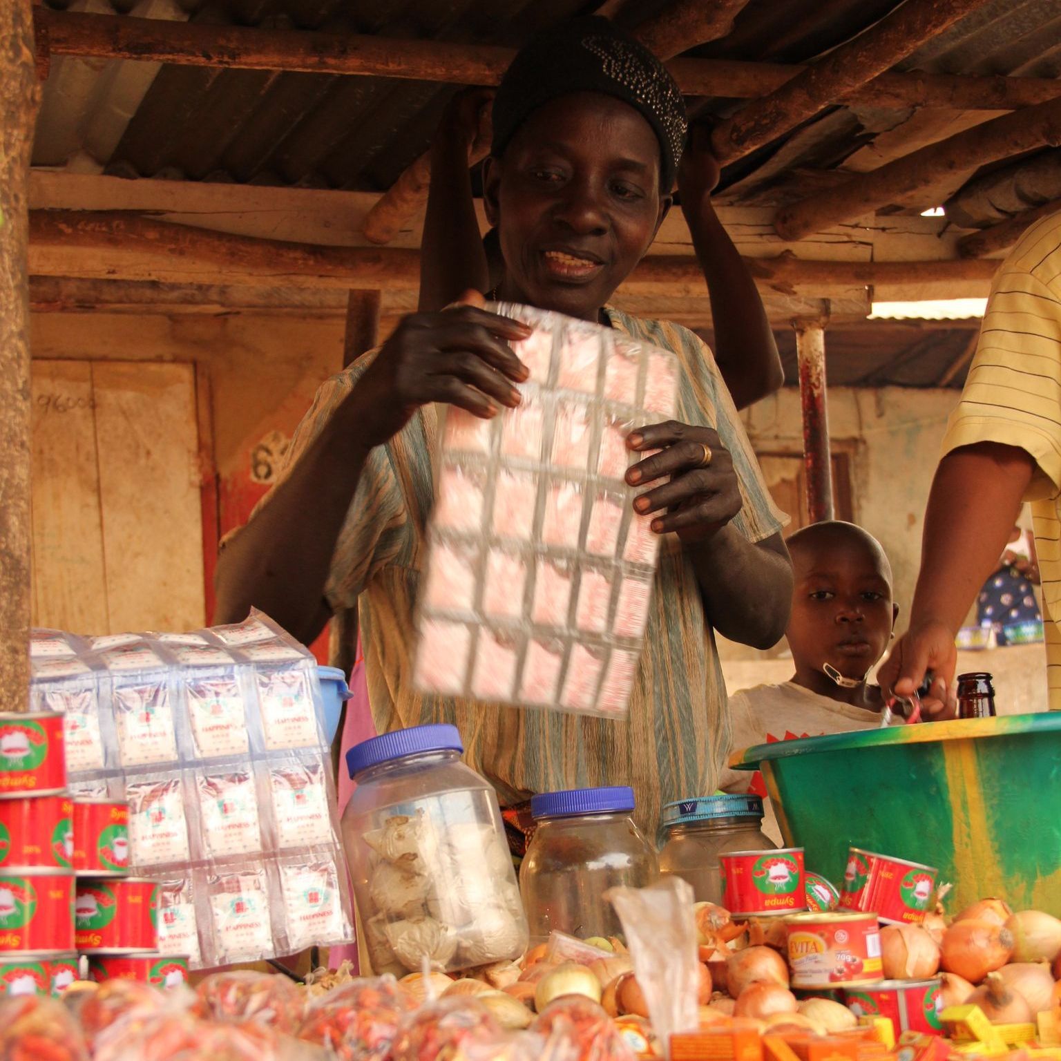 Sikor is one of the very first women's groups to receive microfinance from the organization Mindokatie Salone. She buys bags of rice and sells them in smaller quantities. She also trades in various other foods. Since she started microfinancing, the sales of her stall have increased steadily and she has been able to buy more goods, constantly expanding her range and then selling them again. Within two years her business grew so much that she was able to pay a woman some money to look after the children in her absence.