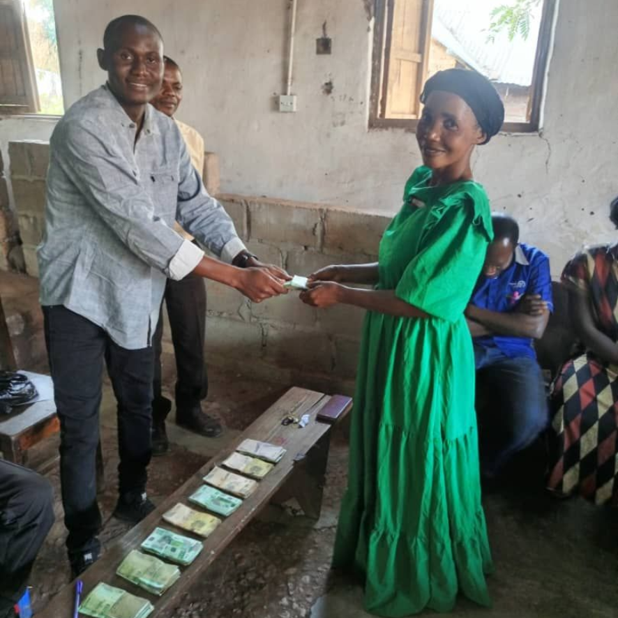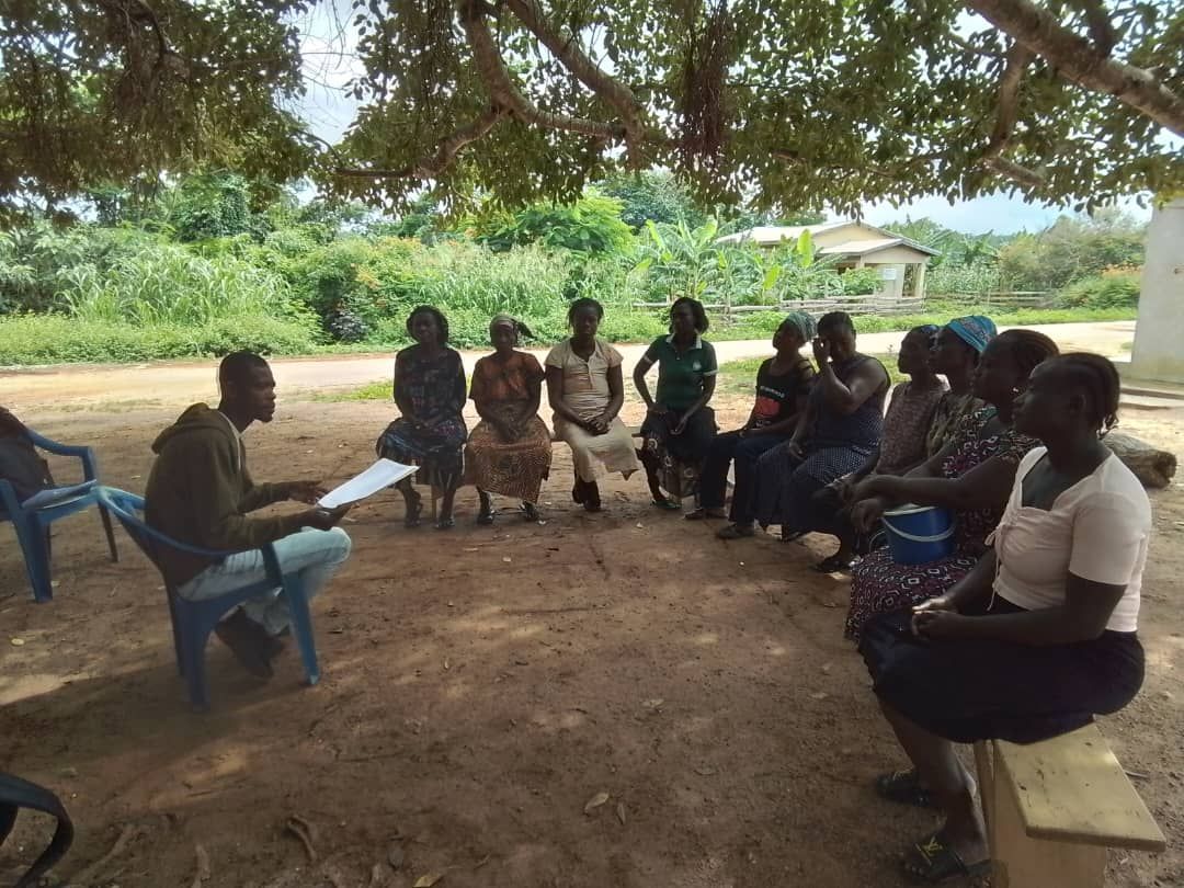 Projektmanager Joseph Mbokani rechts) im Gespräch mit einigen Frauen der Startfinanzierungsgruppe.